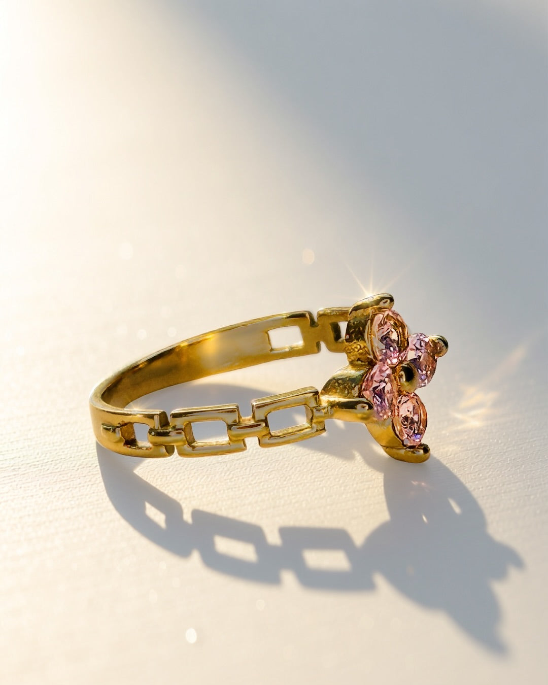 A delicate chain-link band topped with a sparkling flower cluster of clear zircon stones—feminine, bright, and easy to stack. Crafted from stainless steel with 18k gold plating—waterproof, non-tarnish, and won’t green in water for everyday wear.