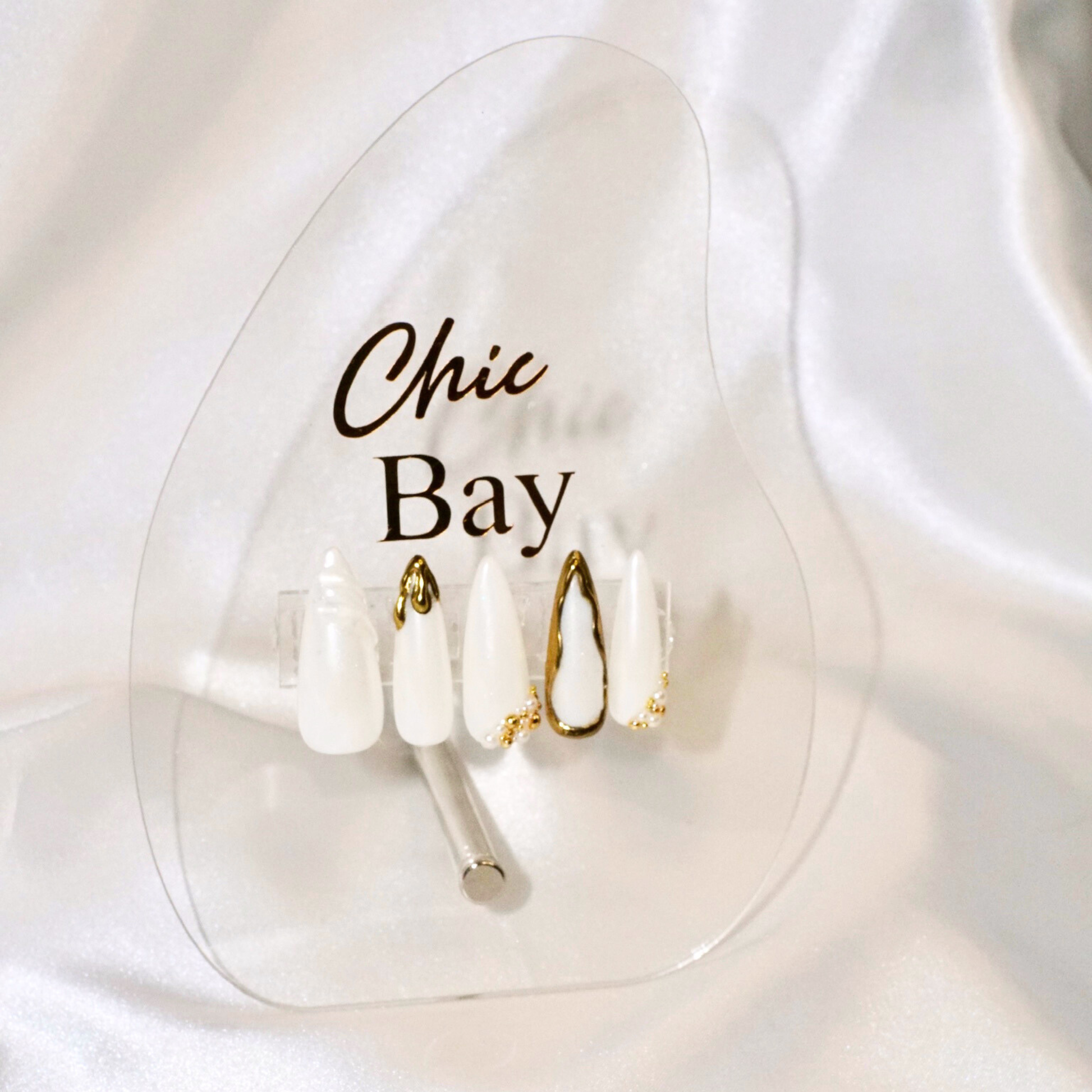 Clean ivory press-ons with gold-trim framing and a crystal cross centerpiece. Minimal, luxe, and designed to stand out without being loud.
