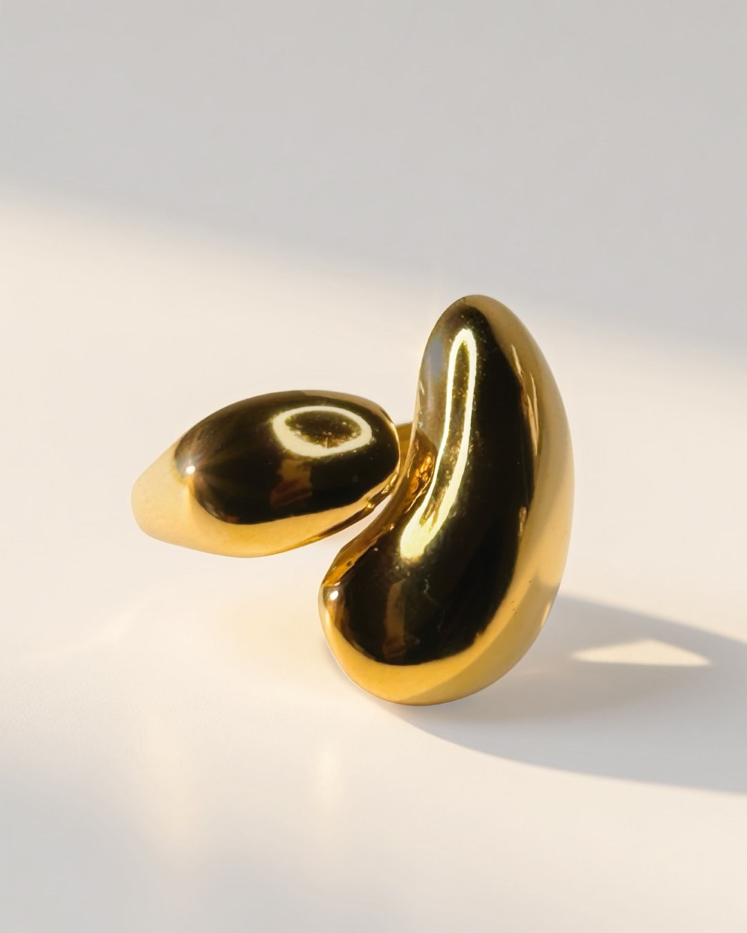 A high-shine open cuff ring with smooth, sculptural curves that wrap the finger like molten gold—minimal, bold, and ultra modern. Made from stainless steel with 18k gold plating—waterproof, non-tarnish, and won’t green in water for everyday wear.
